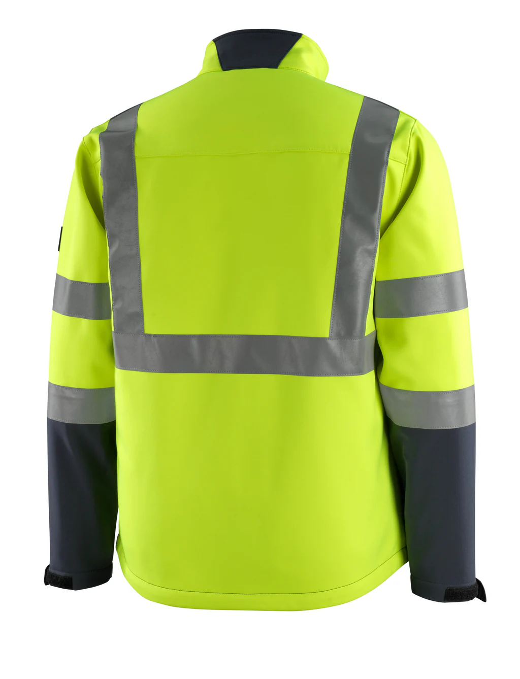 Fluorescencyjny z pionowymi i poziomymi paskami odblaskowymi. Dwukolorowy. Oddychający. Polar po wewnętrznej stronie. Wysoki kołnierz. Zapięcie na zamek błyskawiczny i wewnętrzna klapka sztormowa. Kieszeń na piersi zapinana na zamek błyskawiczny. Przednie kieszenie. Wewnętrzne kieszenie. Zapięcie na rzepy przy mankietach.